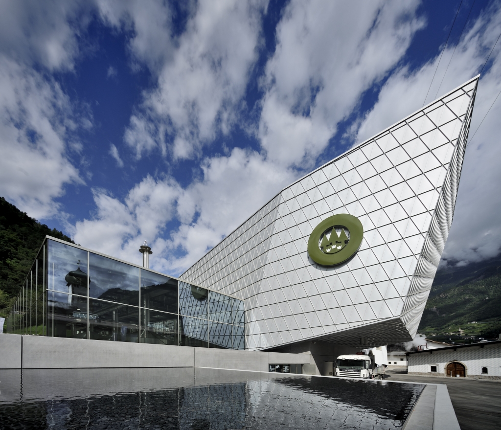 La fabbrica della Forst si presenta come una sorta di villaggio, un microcosmo indipendente armonicamente inserito nel territorio che la ospita, complicato risultava inserire in questo contesto cosi ben modulato un nuovo elemento di così grandi dimensioni. La soluzione è stata la rottura con l'architettura circostante, l'abbandono del sistema di camuffare la funzione a favore dell'immagine, così hanno preso vita forme geometriche inusuali, grandi membrane trasparenti affiancate ad elementi impenetrabili.