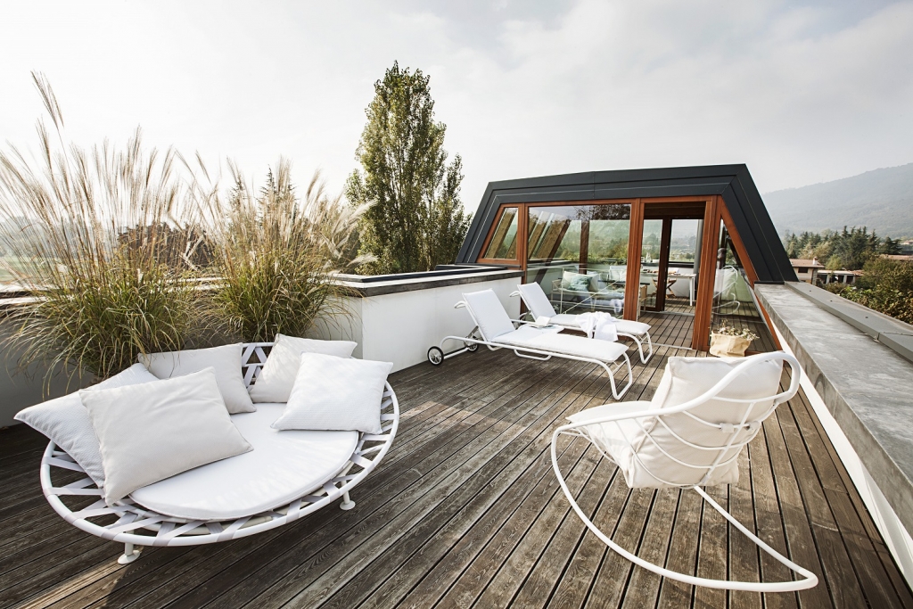 Estesa su un’ampia area, la grande terrazza della Serie Uno consente di godere di uno spazio esterno posizionato in un luogo alto e protetto, offrendo un ampio sguardo panoramico sul paesaggio circostante. Questo spazio può essere impreziosito da un giardino pensile, allestito come salotto en plein air oppure ospitare un grande tavolo per momenti di convivialità; può inoltre fungere da area relaxcon sofà, chaise longue o pouf, solarium, palestra o area gioco per i bambini.