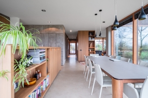 Anche la cucina presenta questo binomio grigio cemento e legno naturale, oltre ad una vista panoramica sul giardino e il fiume. Qui i volumi sono stati progettati per sembrare mobili e fluidi, per conferire un’aria più leggera agli ambienti. Tutto risulta inoltre molto pulito, perché i grandi armadi che scandiscono le pareti della cucina permettono di inserirvi tutto all’interno. Dietro la cucina, si trova un piccolo studio e un magazzino: come nel resto della casa, tutto è stato disegnato su misura e curato nel dettaglio per rendere la casa il più funzionale possibile e sfruttare tutti gli spazi disponibili.