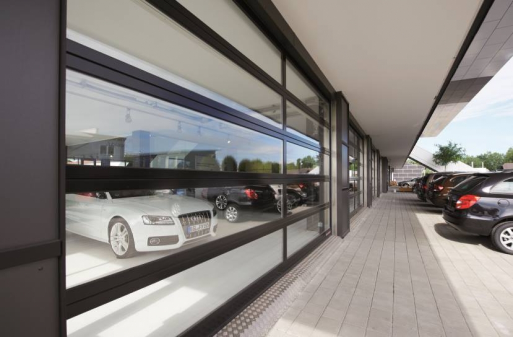 Con il nuovo portone sezionale ALR F42 Glazing, realizzato con solidi profili in alluminio dello spessore di 42 mm e ampie finestrature in vetro minerale, Hörmann realizza una vera e propria vetrina mobile, concreto esempio di architettura moderna, pensato per negozi e showroom, per i quali è importante disporre di una visione completa degli spazi espositivi interni anche dall’esterno.