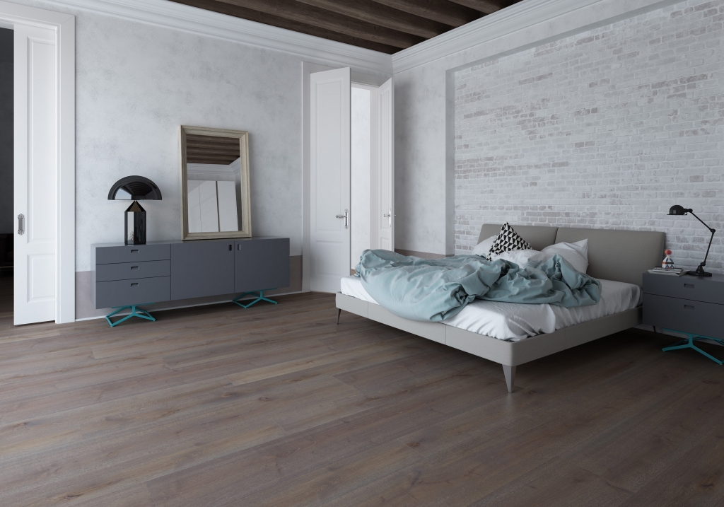 • Sottotitolo: La tradizione artigianale dei parquet Must di Woodco in una camera da letto caratterizzata dal contrasto materico e stilistico.